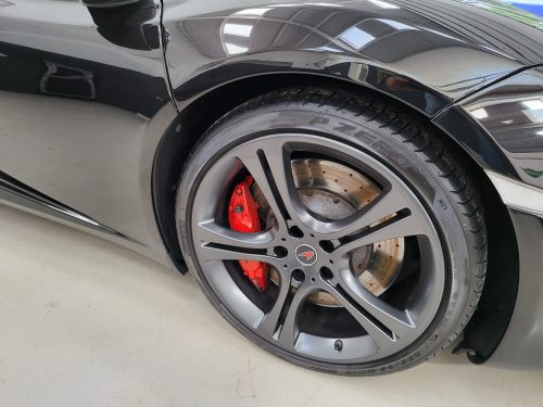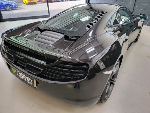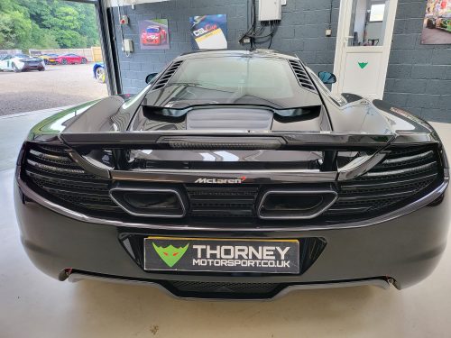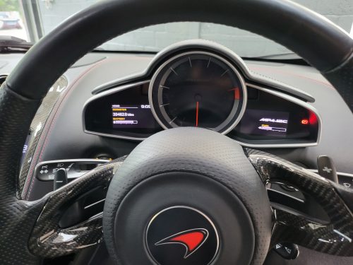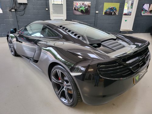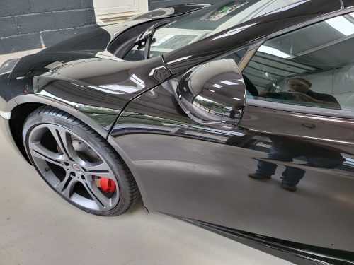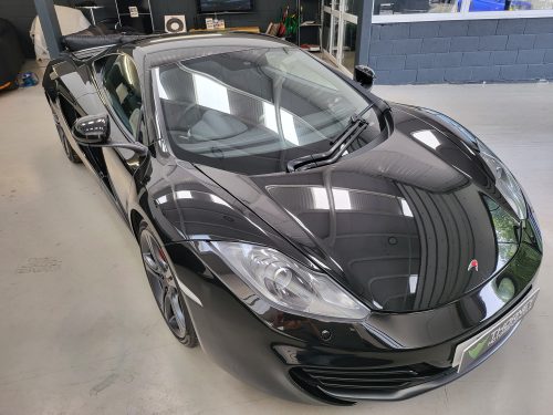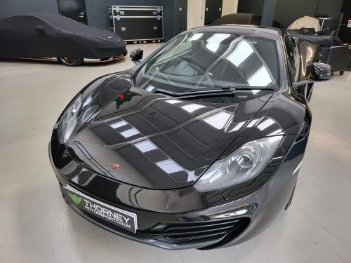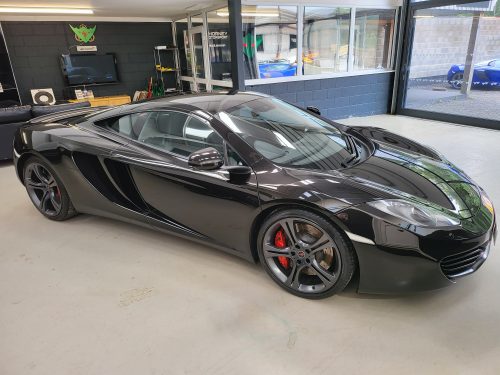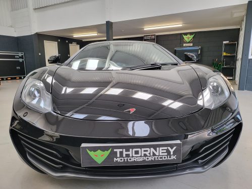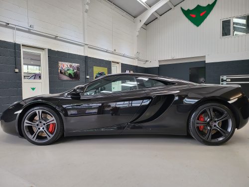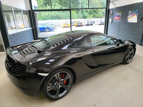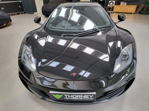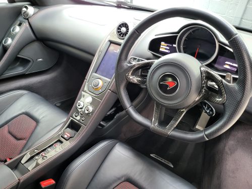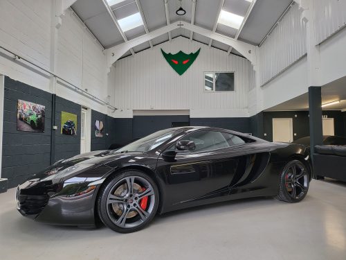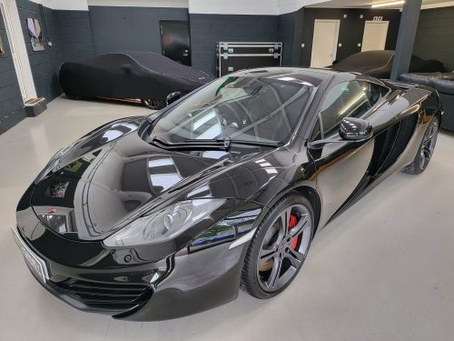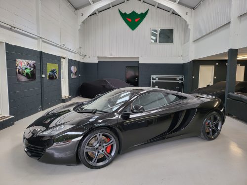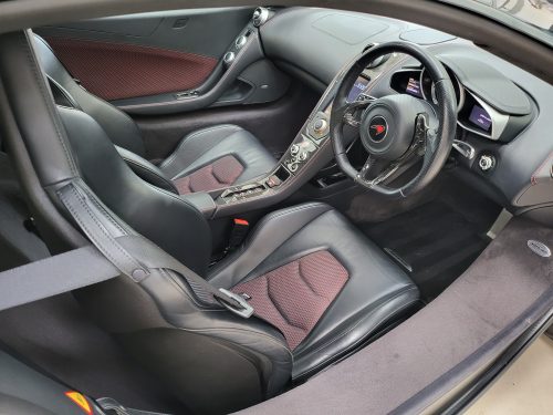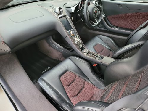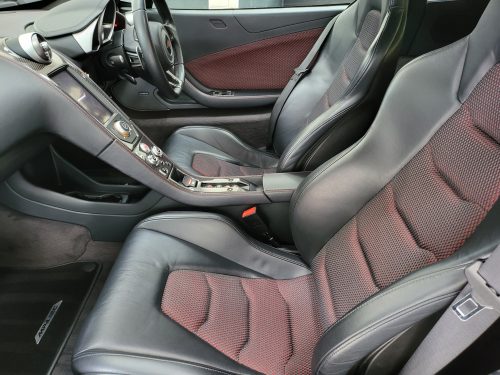 Swipe doors, finished in very rare Fire Black paint (its has a wonderful red fleck in it) the car has a McLaren sports exhaust and gloss interior carbon fibre which sets off the red highlights in the interior trim.