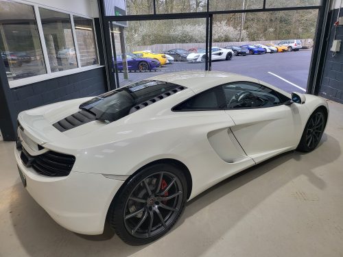Pristine example of an early 2011 12c (chassis 105) in lovely Pearl White Elite paint. We’ve known the car through the past three owners and its been thoroughly maintained and looked after throughout. Fitted with the stealth pack and much desired Super Lightweight wheels with contrasting red callipers it really is a wonderful example. Fully prepared with full service and warranty.