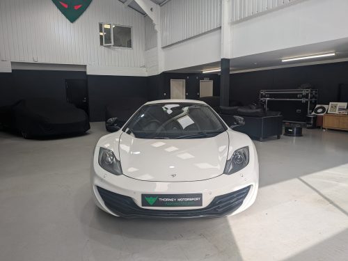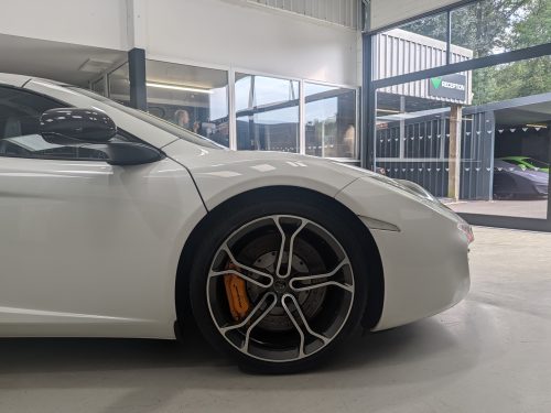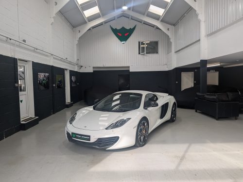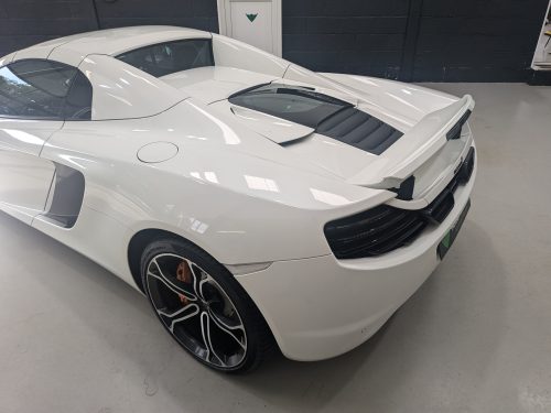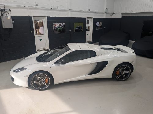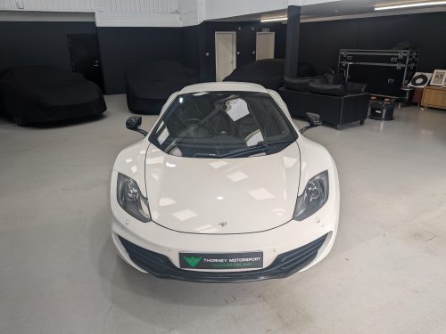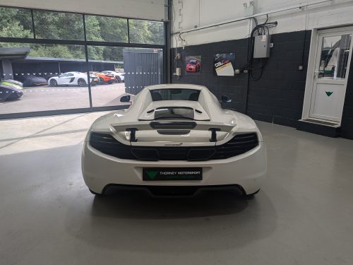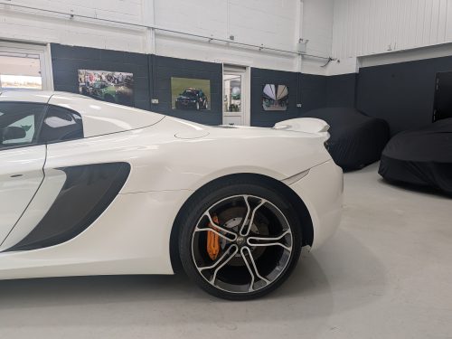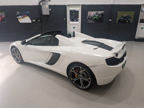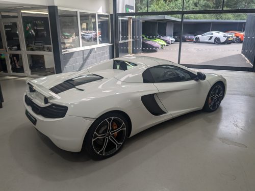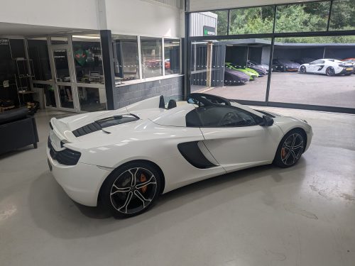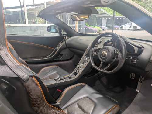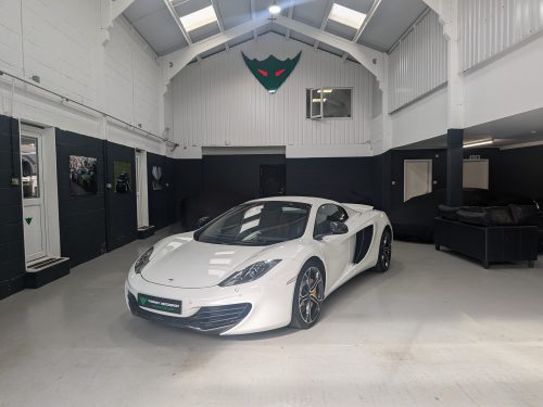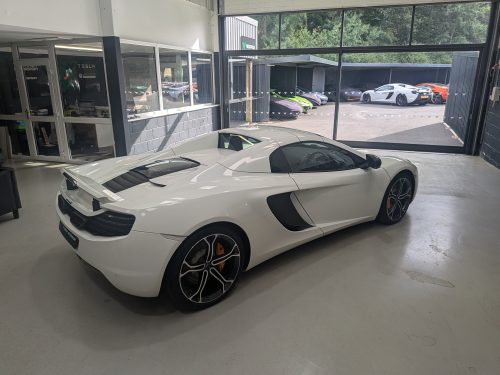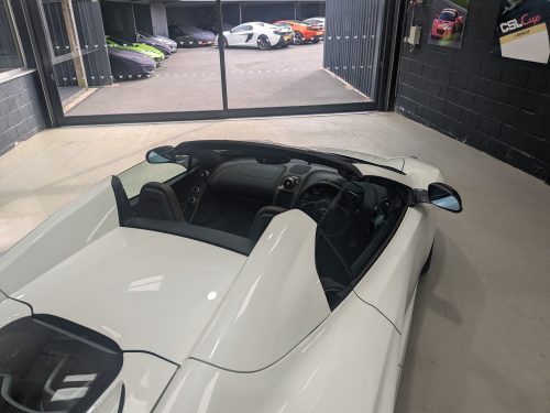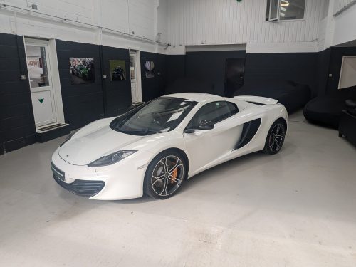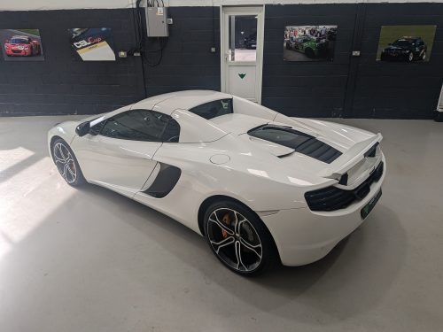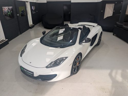 Lovely Pearl white 12c spider with all the right options, carbon fibre air intakes, sports exhaust, carbon mirrors, Stealth pack, carbon fibre interior, black interior with orange contrast stitching, diamond cut wheels, orange callipers, Meridien stereo.