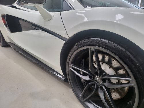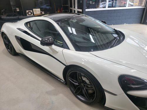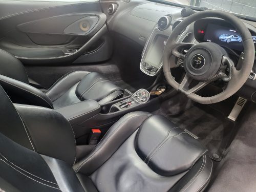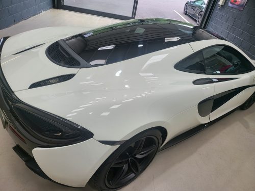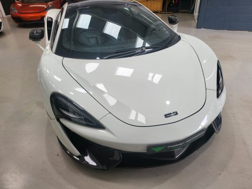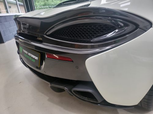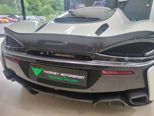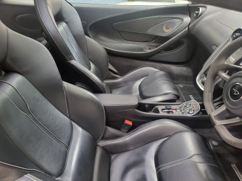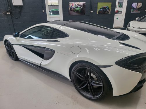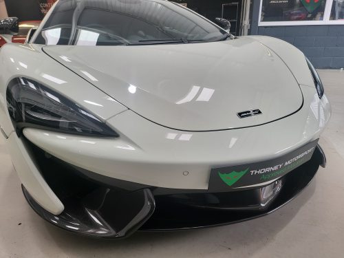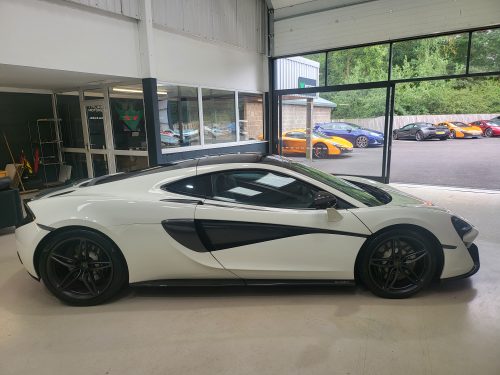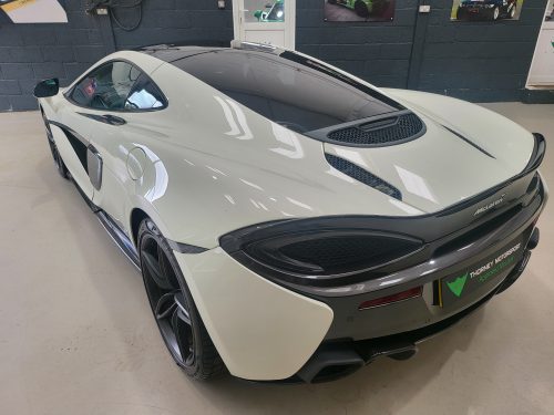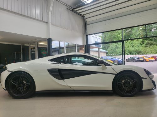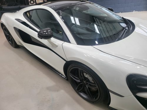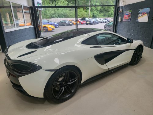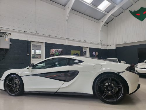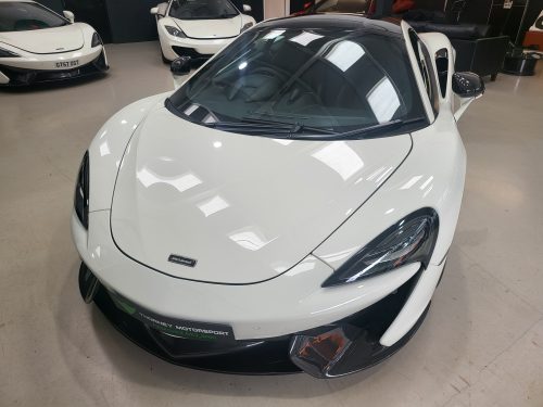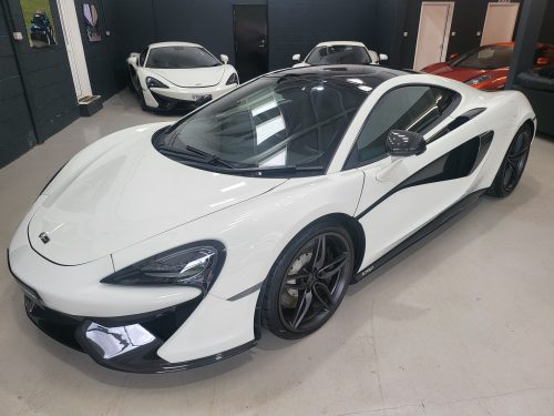 Lovely white 570GT with high specification and low miles. Carbon Pack 2; carbon fibre side skirts, carbon fibre front splitter, carbon fibre wing mirrors, carbon fibre rear diffuser matched with lovely matt carbon fibre interior with contrasting white stitching as well as McLaren sports exhaust. The car also has full PPF installed.